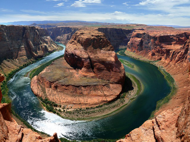 Horseshoe Bend is a superb example of an entrenched meander. Six million years ago, the region around Horseshoe Bend was much closer to sea level, and the Colorado River was a meandering river with a nearly level floodplain. Between six and five million years ago, the region began to be uplifted. This trapped the Colorado River in its bed, and the river rapidly cut downwards to produce Horseshoe Bend as we see it today.