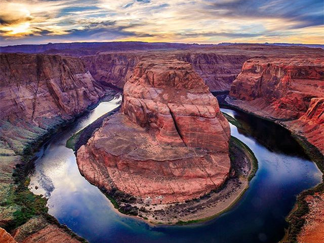The name was inspired by its unusual shape, a horseshoe-shaped meander of the Colorado River. It is located four miles southwest of Page, AZ, within the Glen Canyon National Recreation Area. Standing near the steep cliff above Horseshoe Bend, you will enjoy the best scenic view that has a breathtaking 1,000 foot drop.